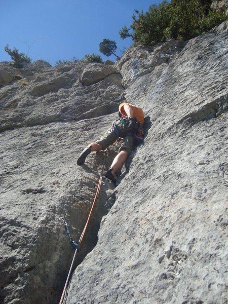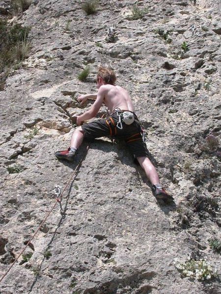Looking through the guide book for some multipitch climbs that everyone could do the location Sinsat 1, Le Pubis, sector GR4B+ was chosen. Upon arriving the discovery was made that the climbs were half way up a mountain, the long walk in the baking sub began. While walking up the foot path it was noted that a number of the climbs on different walls could be linked to make a multipitch ascent which was much longer than the guide book had first indicated, some French climbers were doing this. The topo used for the Foix area was printed from the internet, if pictures had been included it would have been easier to identify the crags and it may have been noticed that the various climbs could be linked up sooner. The climbs were good quality with little polish. This was some member’s first experience of the slightly sparse nature of multipitch bolting.