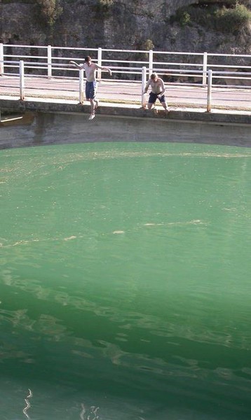 Once all the entertainments of Balaguer were exhausted swimming in the river was suggested and all members agreed this was a perfect way to cool off, near to the camp site was a lake that looked ideal. At the entrance to the lake a small bridge crossed, at approximately 5 m high it was a good height for jumping into the river from. After extensive testing by throwing rocks of various size into the river it was deemed safe enough for Fails to jump in. Driving the minibus off the bridge and into the river was also put forwards as a more conclusive test but the barriers next to the road prevented this. After Fails jumped into the water with a small Spanish audience and survived it was then considered safe enough for the other more valuable members to enter. Murray took the longest to get over his psyche problem but did jump in the end. The water was very cold and quick exits were made by all.
