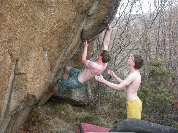 Arriving at Targasonne and not having a guide book meant finding the climbing was rather difficult, driving along the road many small boulders were pointed out until rounding a corner a gigantic boulder field appeared and it was obvious where they were meant to go. Parking in a road version of an oxbow lake, the bus was unloaded and everyone headed off in the direction of the closest boulders. The plan was to wonder around and find cool looking problems to try and not worry about grades or what was possible, a plan which proved to be excellent. The first big boulder that base camp was set up at had a number of problems on which were all enjoyable. The top out appeared flat when climbing but long chalk streamers ran down the top of the rock that guided the hands to hidden jugs. People wondered around for a while each picking out their own rocks of interest. Fails and Adrian found an impressive problem that they spent most of the day working requiring difficult moves into under cuts and a top out that was not particularly friendly. After many attempts and almost at the end of the day Adrian almost made an ascent but failed at the final move when he tried to pull onto the top but found there were only prickly bushes, making a dynamic retreat all the observers saw his grazed torso caused by the top out. Inspired by this effort fails put a tee-shirt on and managed to top out the problem grading it V6+ or V7. Several other problems were climbed and not climbed and overall everyone had a very good day.
