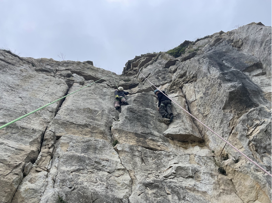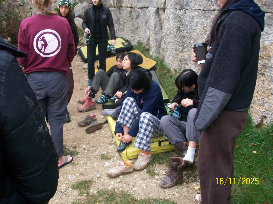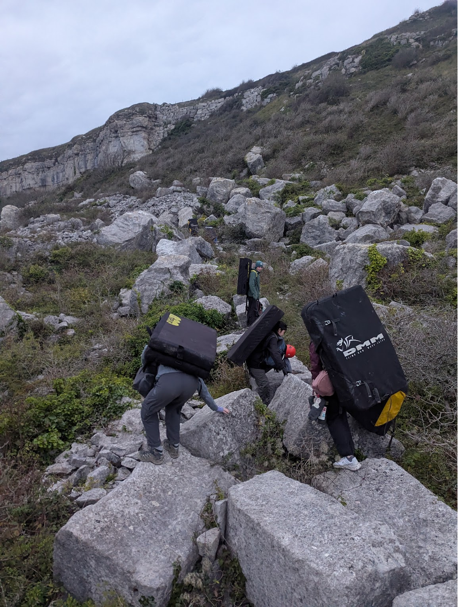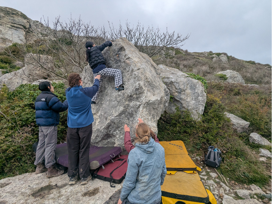 We headed to the cuttings for some climbing, where Asha and Hannah gave a masterclass on outdoor bouldering, teaching everyone about the nuance in pad placement, spotting technique and general etiquette. Now equipped with training and safety, the group split into ropes and boulderers for some epic climbing.