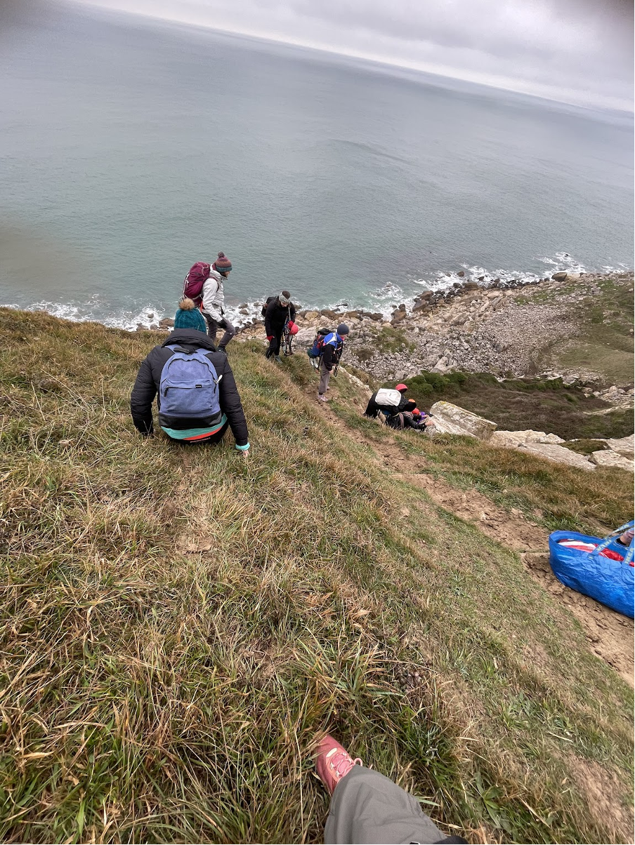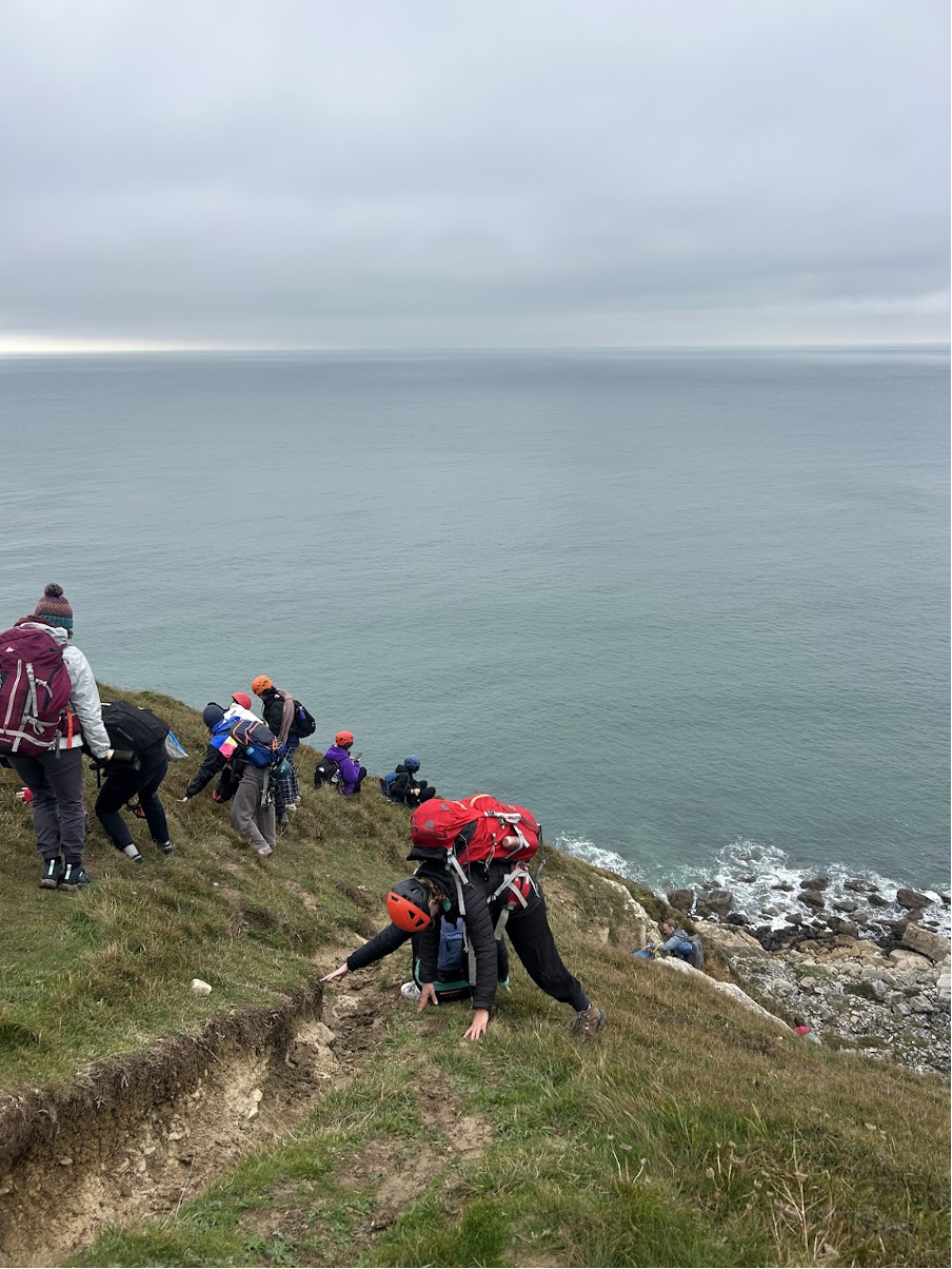 Amy skillfully navigated the minibus to park in a lot next to Battleship edge and everyone unloaded onto the beautiful, flat carpark. While everyone was sorting out our ropes, harnesses and clips instead of the 8 bouldering pads, Sofia went ahead to see if the crag was dry. We also met up with one of the alumni cars. After a text and gleeful confirmation from Amy that the crag was indeed dry, we set out on our Approach.