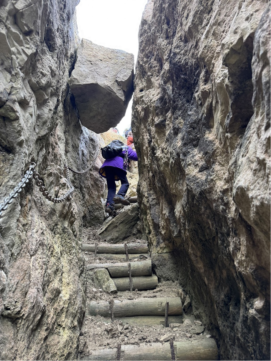 What seemed like a straight-forward trek through maybe a bit of a muddy path turned into the hardest route of the entire trip. After 20 minutes of walking through puddles and very squishy mud, a right turn revealed the true horror of the approach: a free-for-all vert slip and slide on the edge of a cliff. Let’s just say that the zero injury rate is a true accomplishment, and everyone got through the approach 50% mud free. After the vert slip-and-slide, there was a sandbagged V2 boulder/scrabble to actually get to the crag, which everyone flashed (albeit with aid from the chains)! (thank you Natasha, Amy for carrying the food bags) As everyone recovered from the treacherous approach, the foggy, dreary weather finally began to clear.