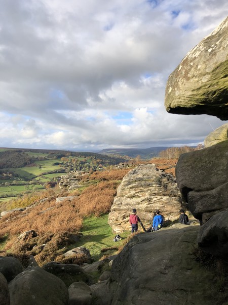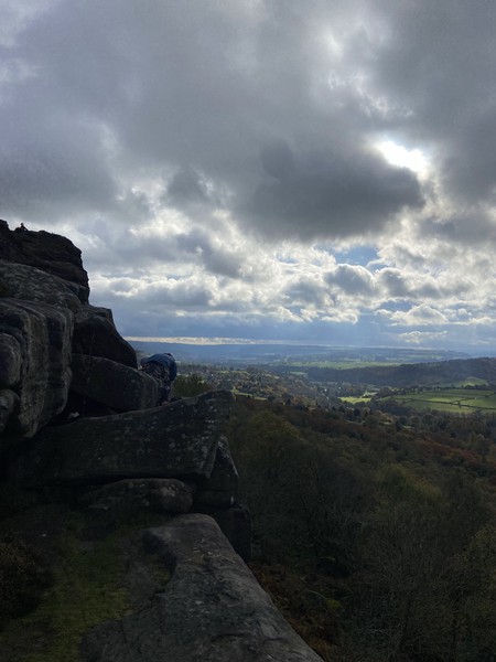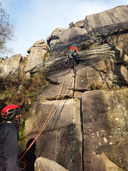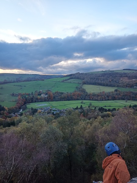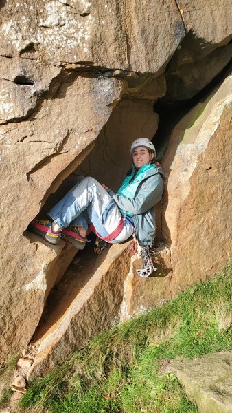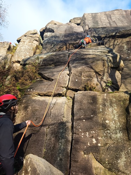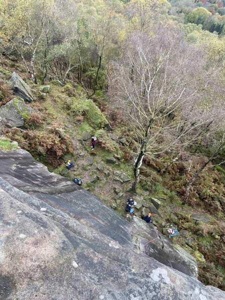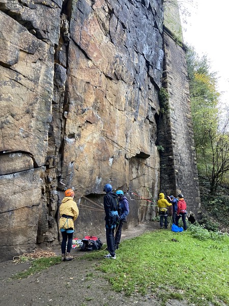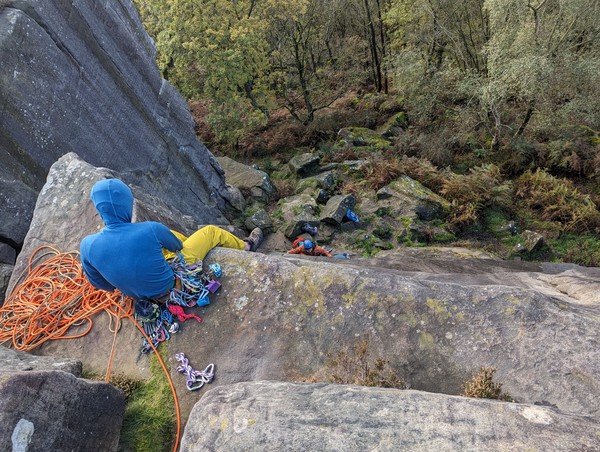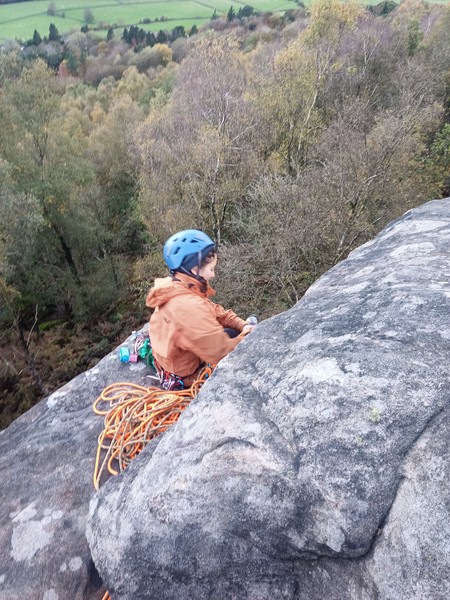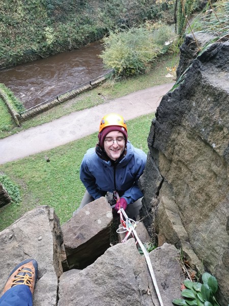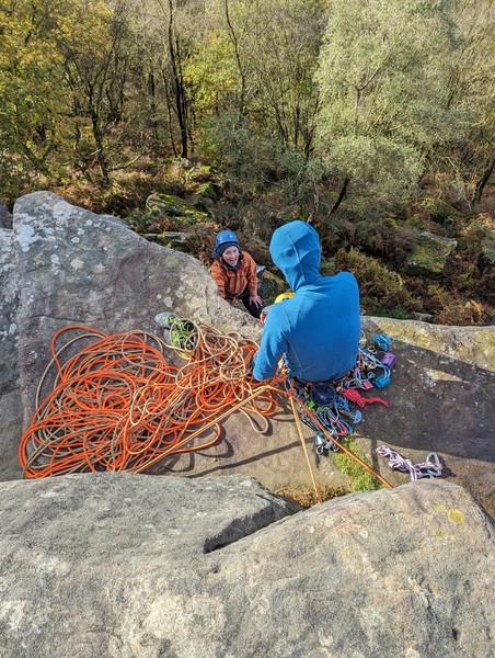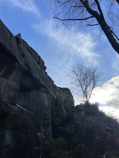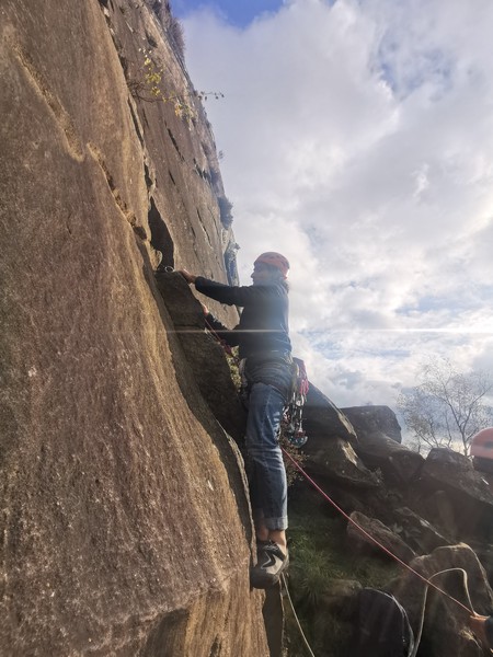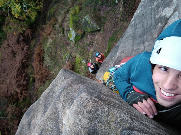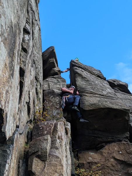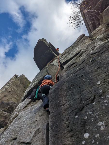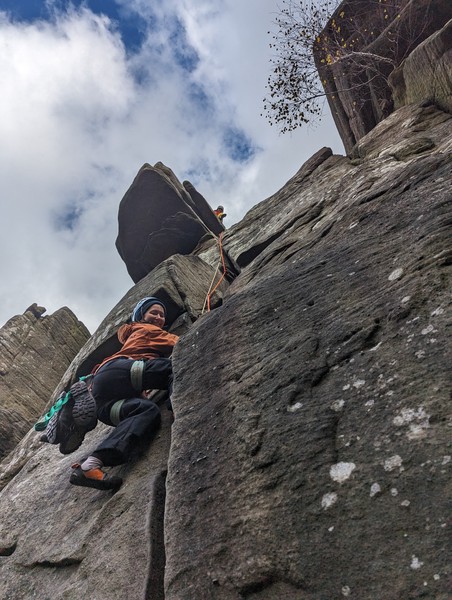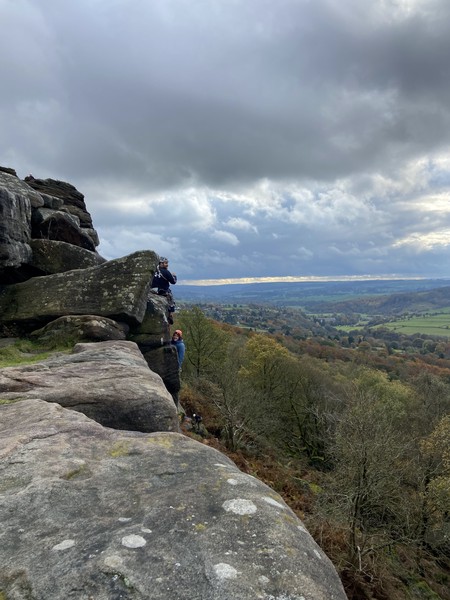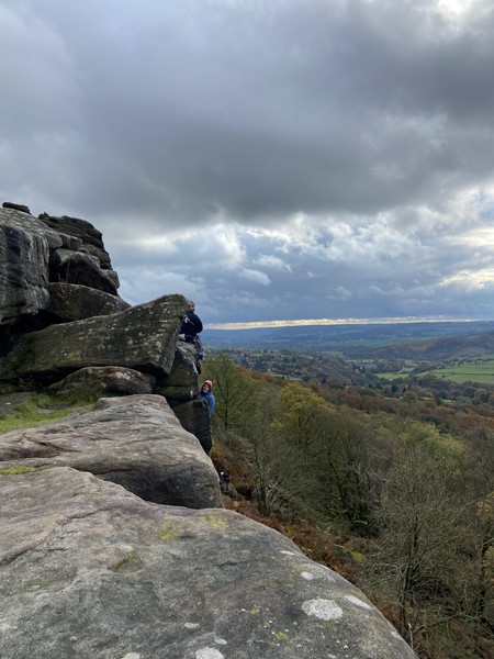 Having assessed the weather the night before (not good), we decided that Saturday would start with a lie in. Overnight oats proved to be a huge success (would recommend to all future trips). It was then time for a theory lesson from Gil and Miguel, top tier trad dads. We then set off for New Mills Tor, which UKC assured us would, “stay dry, even in monsoon weather”.