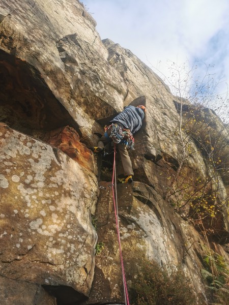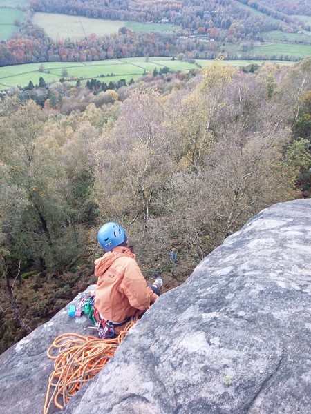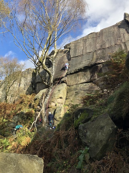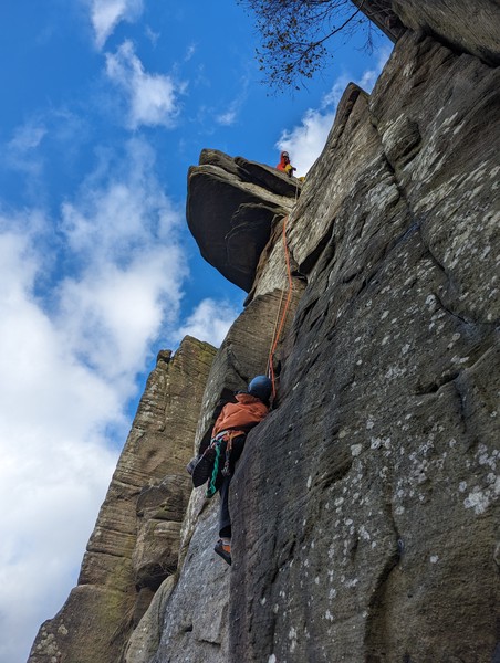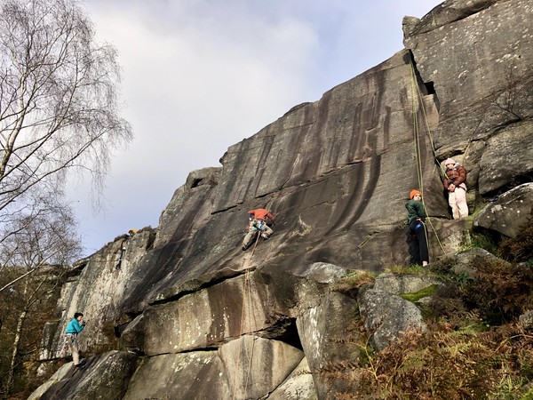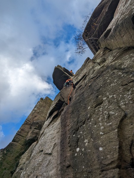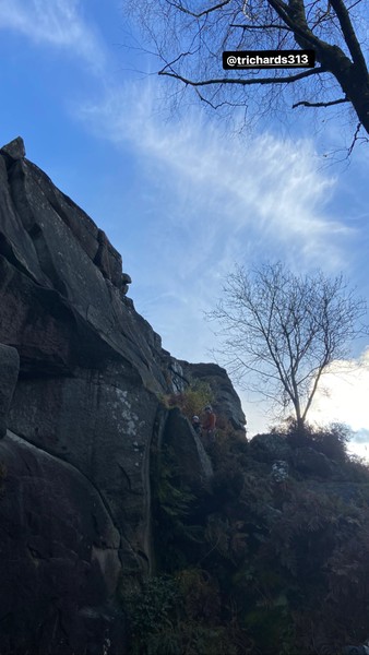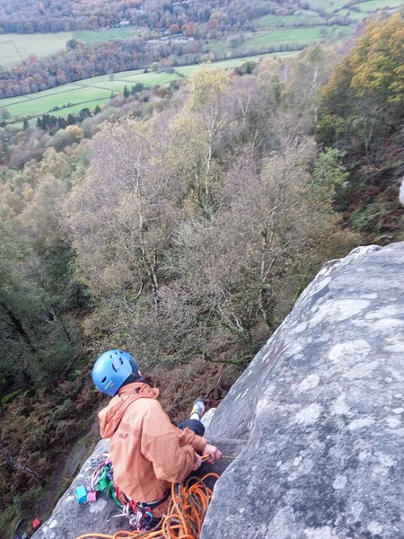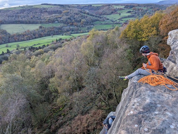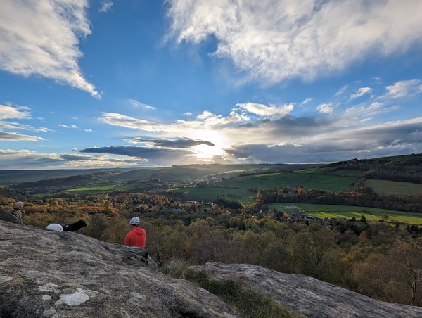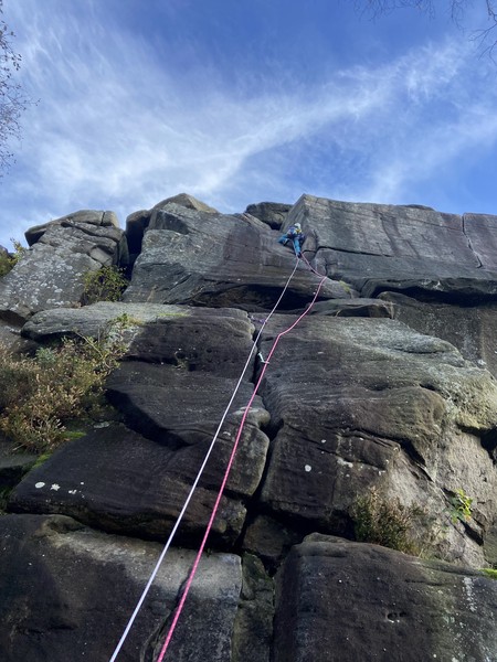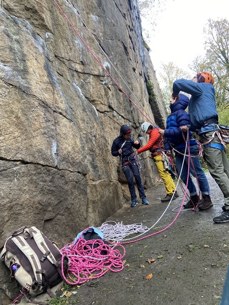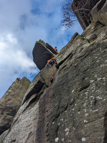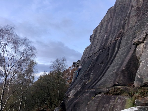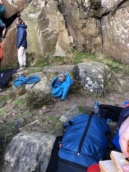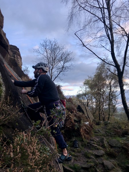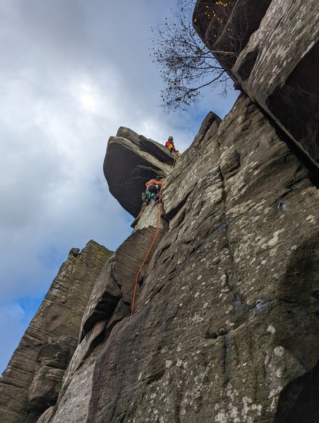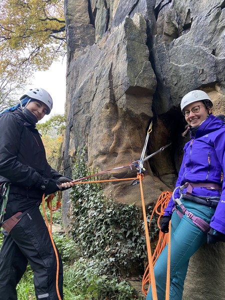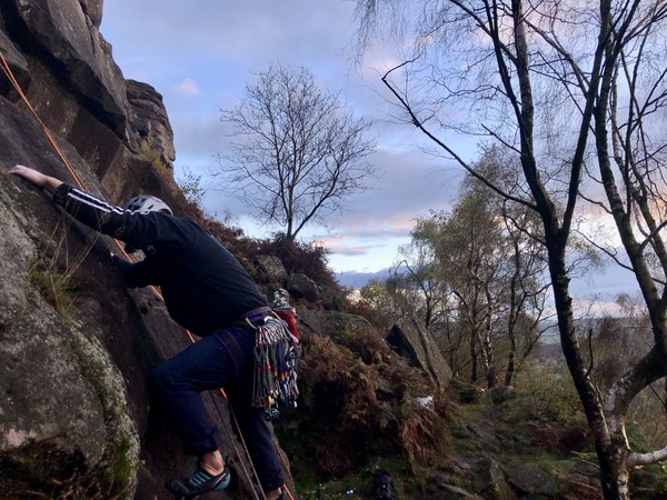 Having assessed the weather the night before (not good), we decided that Saturday would start with a lie in. Overnight oats proved to be a huge success (would recommend to all future trips). It was then time for a theory lesson from Gil and Miguel, top tier trad dads. We then set off for New Mills Tor, which UKC assured us would, “stay dry, even in monsoon weather”.