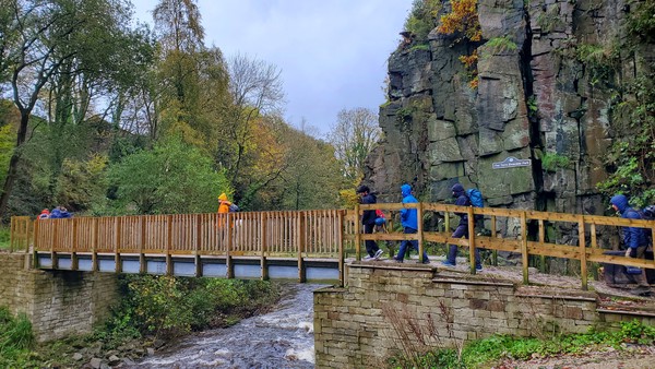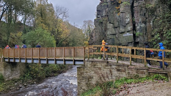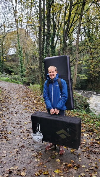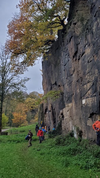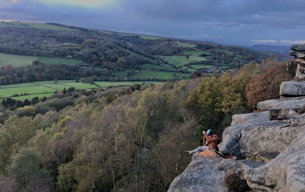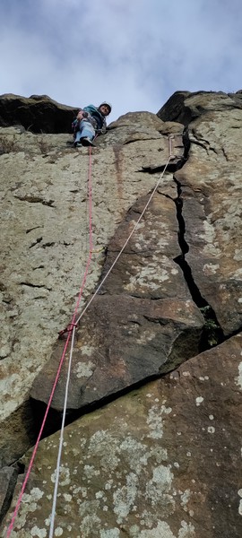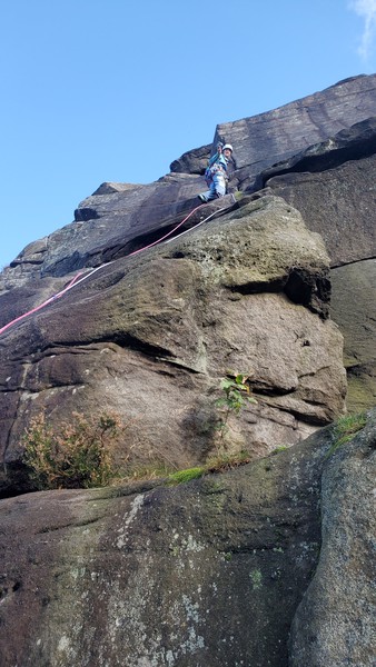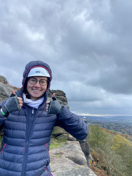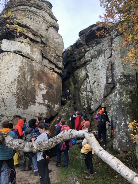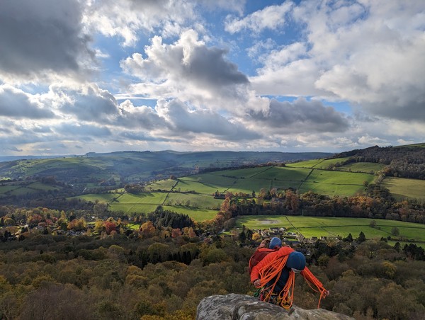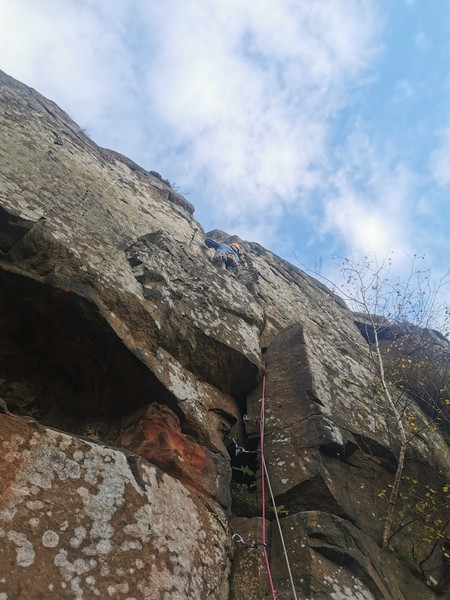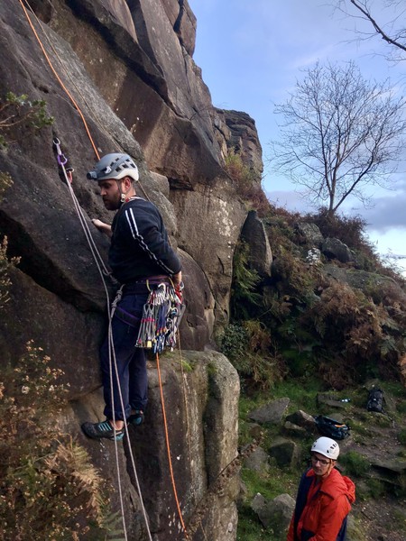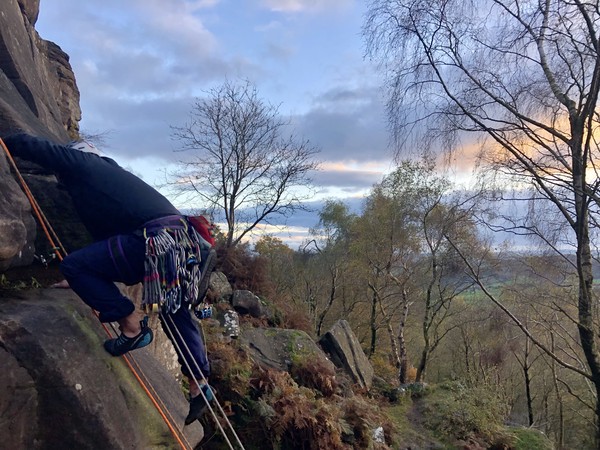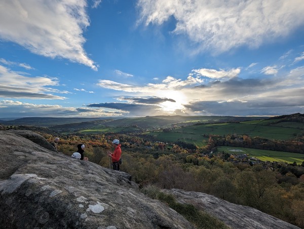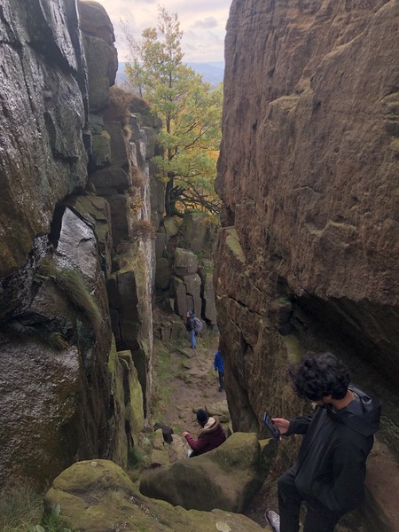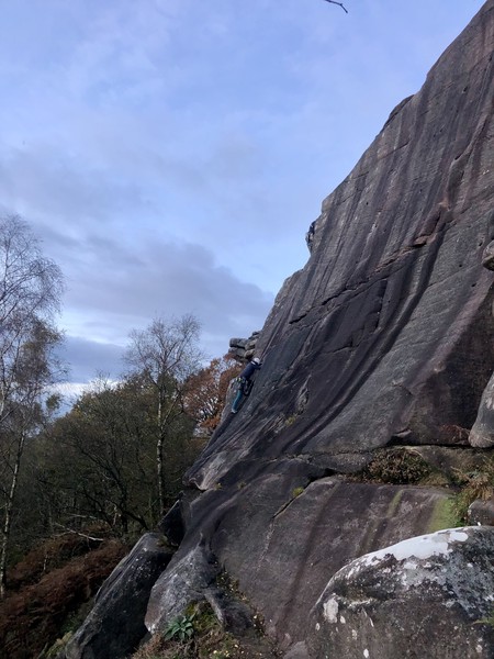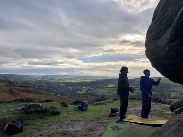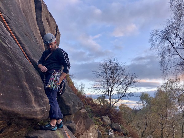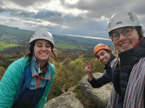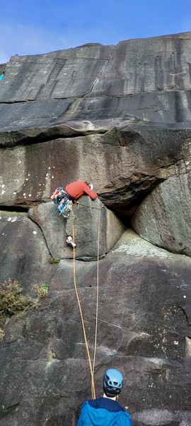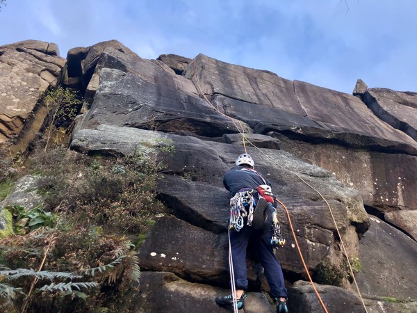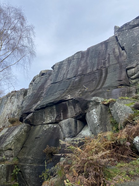 Having assessed the weather the night before (not good), we decided that Saturday would start with a lie in. Overnight oats proved to be a huge success (would recommend to all future trips). It was then time for a theory lesson from Gil and Miguel, top tier trad dads. We then set off for New Mills Tor, which UKC assured us would, “stay dry, even in monsoon weather”.