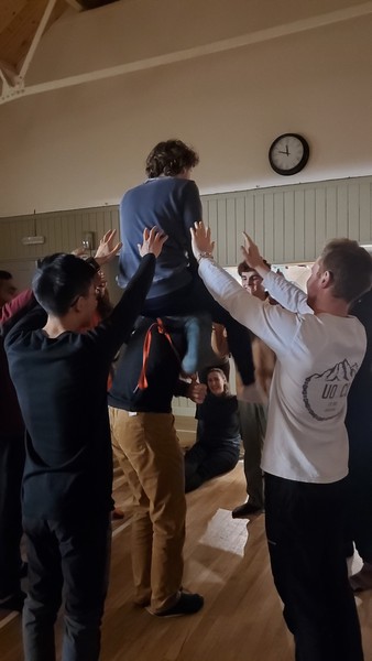The night’s activities involves a competitive cereal box game, followed by the sling game, where two players have to pass through a knotted sling placed around their feet on the floor. Sean and Wilson got very VERY close, Sofia was kicked in the face by Amy, lots of spotting practice occured.