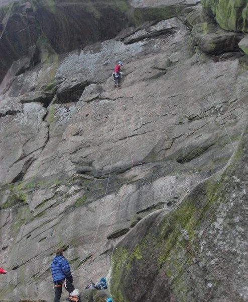 Fresher and I went to Jamtastic Ramshaw Rocks while everyone else went to the Roaches. I lead Phallic Crack (S) and Battle of Bulge (VS). On Battle of the Bulge I entertainingly kicked out my first gear as I moved past it and proceeded to place very suspect runners to the top. I then proceeded to be a little silly and fail to start the crank, I will return. Fresher the lead a severe crack, finding it pleasant and jammy. At the Roaches lots of teaching and fun climbing/bouldering went on.