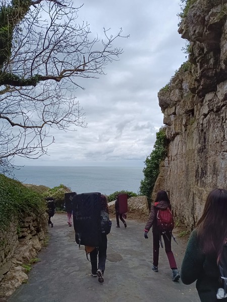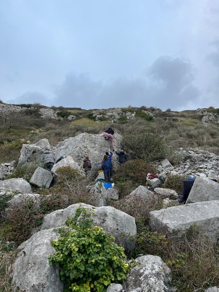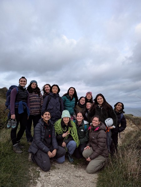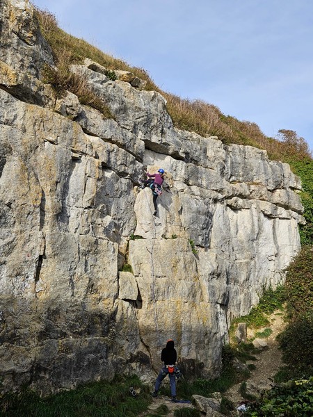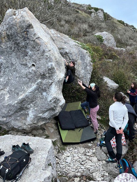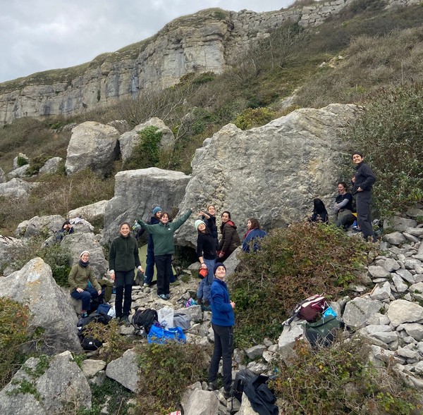 We had one quick stop at the services on the way to Portland to freshen up where everyone, now slightly more awake from their coffees, was able to introduce themselves (we decided it was still too early for a “Say one fun fact about yourself!” type of icebreaker, so stuck to just names and pronouns). To maximise daylight hours, we drove straight to the crag carpark. Pads on our backs, we headed down to Cuttings Boulderfield. Even though it wasn’t my first time taking this approach, the sight of the sea emerging as you walk beneath the ruins of a castle bridge still took my breath away. We paused for a safety brief from Asha, as for many of us (me included), it was our first time bouldering outdoors. In hindsight, we probably should’ve done this where there was a better phone signal, because the next 20 minutes were spent trying to send screenshots of the topos from Amy’s RockFax to everyone.